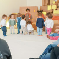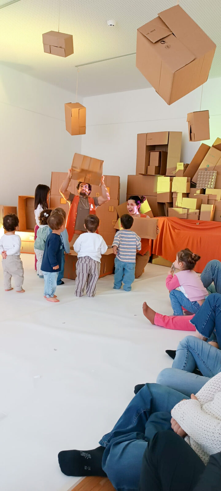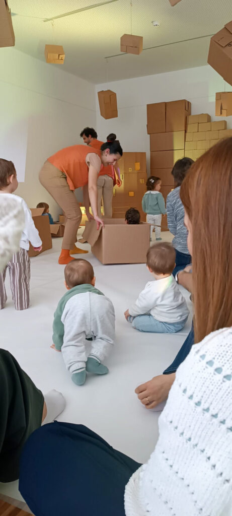 Inspirado na obra “O Homem que Amava Caixas” e em princípios associados à abordagem pedagógica de Maria Montessori, o atelier propôs uma experiência centrada no jogo simbólico, na curiosidade e na interação com diferentes materiais. As caixas assumiram múltiplas funções, ora como abrigo, ora como objeto de surpresa e transformação, convidando à experimentação livre.