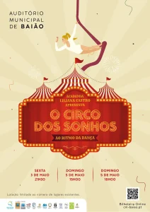 Dia 5 de maio às 15h00 e às 18h00, o Auditório Municipal de Baião será palco do espetáculo “Circo dos Sonhos”. Um espetáculo onde a magia se funde com a dança, proporcionando a quem assiste, a recordação de como é bom ser criança. Tendo como inspiração o tema imaginário do circo, são mais de 140 participantes, entre os 2 e os 23 anos, que, nestas três sessões sobem ao palco, representando vários estilos de dança.
