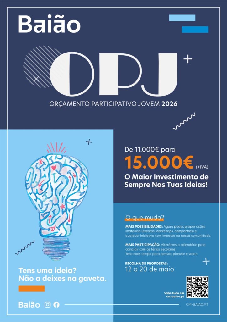 O Orçamento Participativo Jovem (OPJ) de Baião apresenta, em 2026, um reforço do montante disponível, passando de 11 mil euros para 15 mil euros, numa medida que pretende ampliar o impacto das propostas apresentadas pela juventude do concelho.