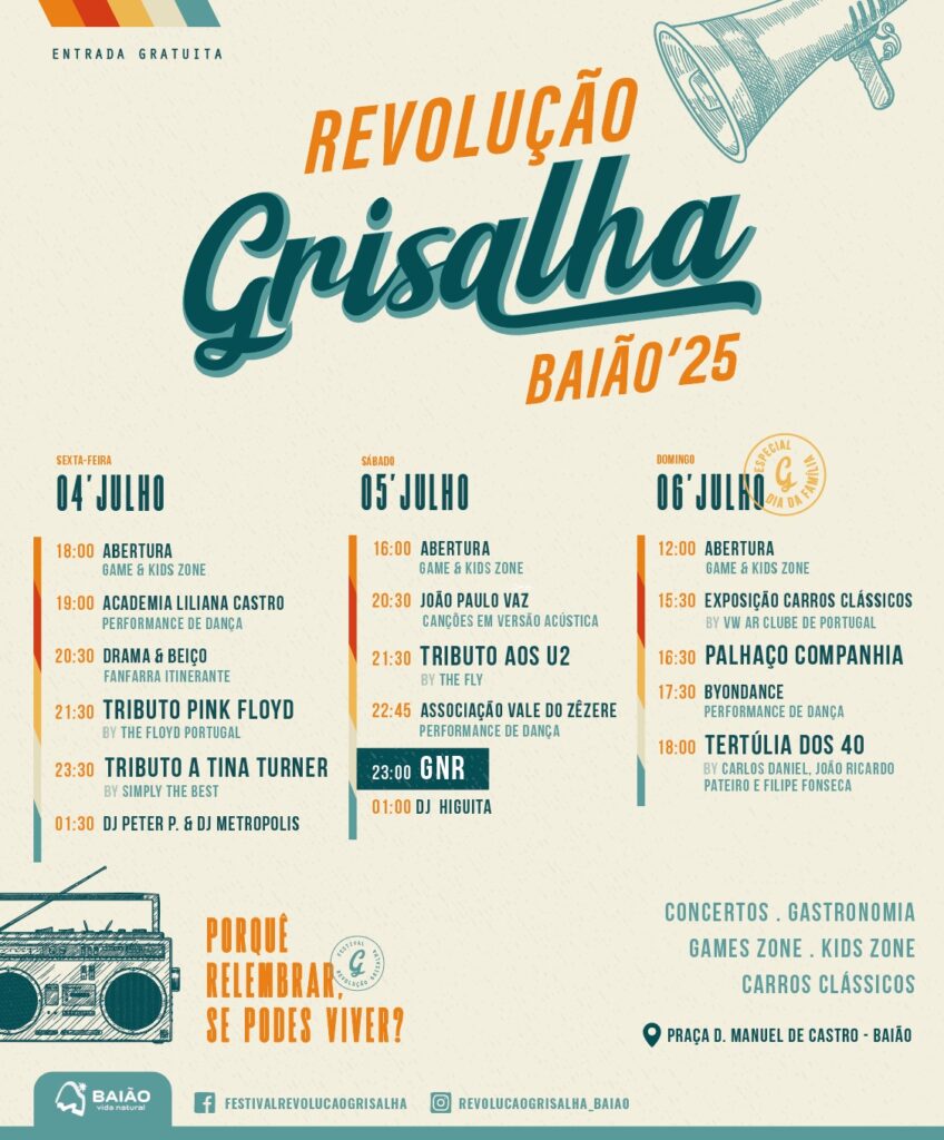 A Revolução Grisalha regressa para a sua terceira edição entre os dias 4 e 6 de julho, desta vez na Praça D. Manuel de Castro, na Vila de Baião. Com entrada gratuita, o festival promete animar toda a família, proporcionando uma viagem no tempo pelas décadas de 60, 70 e 80, com especial destaque para os anos 80.